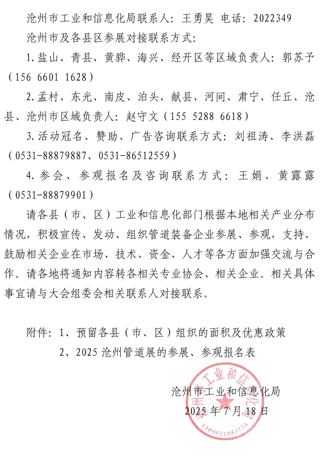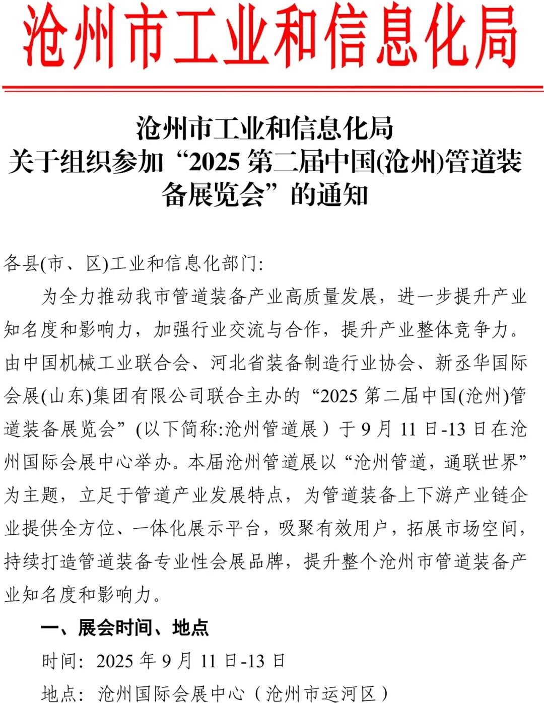 沧州市工信局关于组织参加"2025沧州管道展"的通知