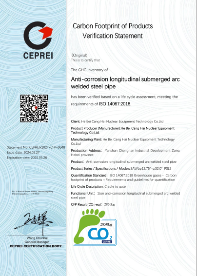 此次参评的3PE直缝埋弧焊钢管自研产品成功完成碳足迹核查,并顺利获得碳足迹证书,充分体现了沧海核装在产品设计、生产和供应过程中各环节对降低碳排放的重视。