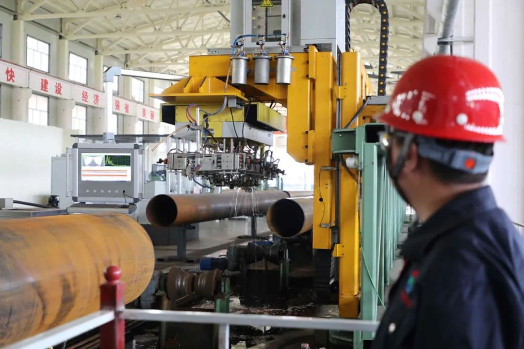 在河北海乾威钢管有限公司车间内的全智能化生产流水线上,工人们正在生产1万吨的大口径直缝埋弧焊钢管。据了解,这是一条大口径、高钢级直缝埋弧焊钢管生产线,钢管主要用于石油天然气的输送。工作人员可以通过电脑、手机APP,实时监测生产质量和进度。
